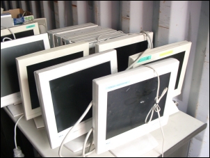 デスクトップパソコン(約60台)とモニタ(約100台)が入りました。