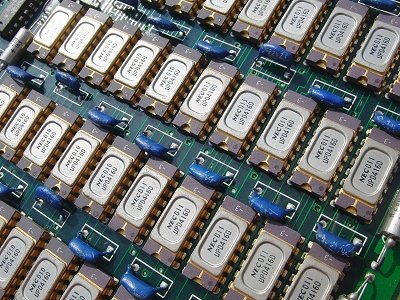 背が低く、足の多いIC(集積回路)が密度高く実装されているのが分かるかと思います。 何れも昔のコンピューター系基板です。 今のコンピューター系基板は、性能は格段に上ですが、金属的には価値が格段に下です。 金属的に無駄がない(コストダウンに成功)と言えますので、良いことではあるのですが。 基板(上)の接写写真上記の基板の接写写真です。